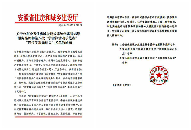 近日,安徽省住房和城鄉(xiāng)建設(shè)廳公布了第八批全省住房城鄉(xiāng)建設(shè)系統(tǒng)“崗位學(xué)雷鋒標(biāo)兵”名單,表彰一批樂(lè)于奉獻(xiàn)、自覺(jué)踐行雷鋒精神的崗位標(biāo)兵。公司職工石懷遠(yuǎn)、趙玉珠獲此殊榮。