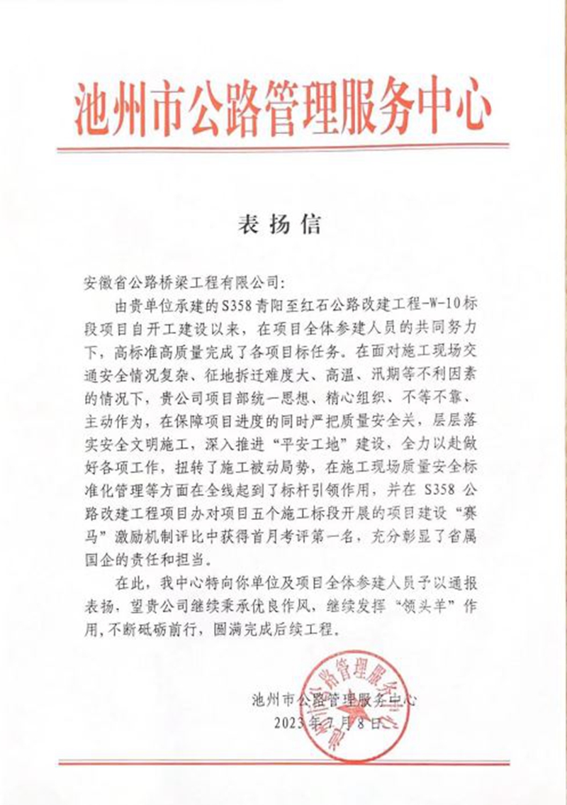 近日,公司收到池州市公路管理服務(wù)中心表揚(yáng)信。