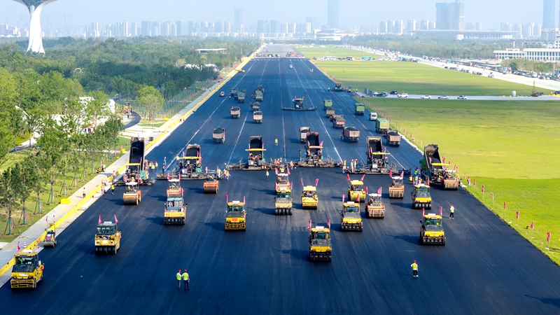 本次瀝青施工是安徽省內(nèi)首次實(shí)現(xiàn)60米全幅一次性施工成型,設(shè)備投入多、組織難度大,使用2臺(tái)拌合站供料,80余臺(tái)運(yùn)輸料車、6臺(tái)福格勒固定板攤鋪機(jī)組陣攤鋪,24輛壓路機(jī)梯隊(duì)作業(yè),120名管理人員及施工人員,連續(xù)奮戰(zhàn)12小時(shí),共鋪設(shè)瀝青混凝土6000余噸,順利完成了長(zhǎng)度為1250米的瀝青攤鋪施工,成功為老機(jī)場(chǎng)跑道換上“新衣”。