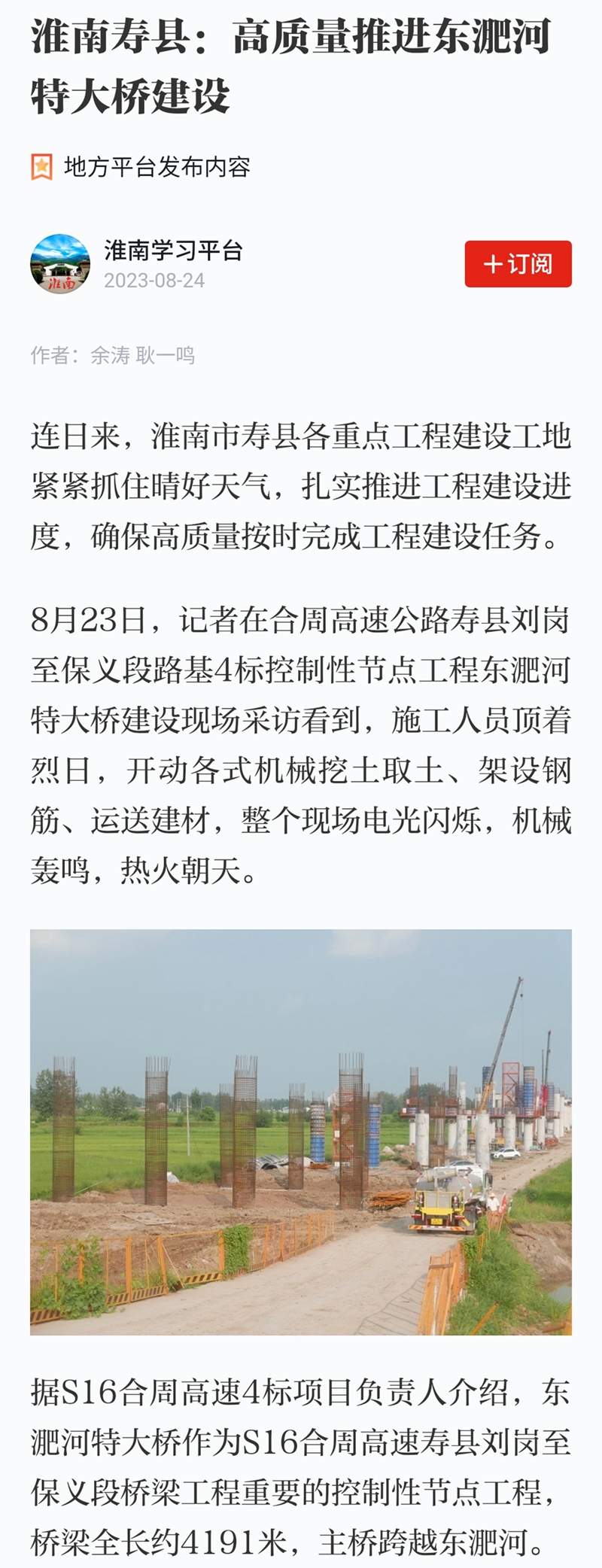 【名媒聚焦】學習強國——安徽路橋:高質量推進東淝河特大橋建設
