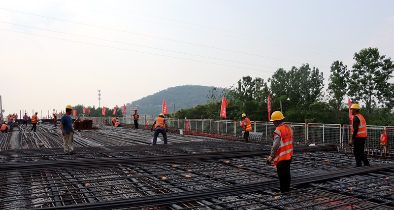 小蜀山東路上跨橋是項目控制性施工節(jié)點。施工現(xiàn)場車流量大、重型貨車多且新建道路與既有道路存在較大高差導(dǎo)致交通組織極其困難,小蜀山東路南側(cè)房屋未拆遷,現(xiàn)場幾乎無施工作業(yè)面。面對重重困難,為保障此節(jié)點順利完成,項目部提前謀劃,多次組織相關(guān)單位召開方案研討會,優(yōu)化施工方案,并通過科學組織施工,前后組織十余次交通導(dǎo)改,巧妙利用南幅新建橋梁作為施工便道和作業(yè)面,歷時45天順利實現(xiàn)全線首座上跨橋雙幅貫通。
