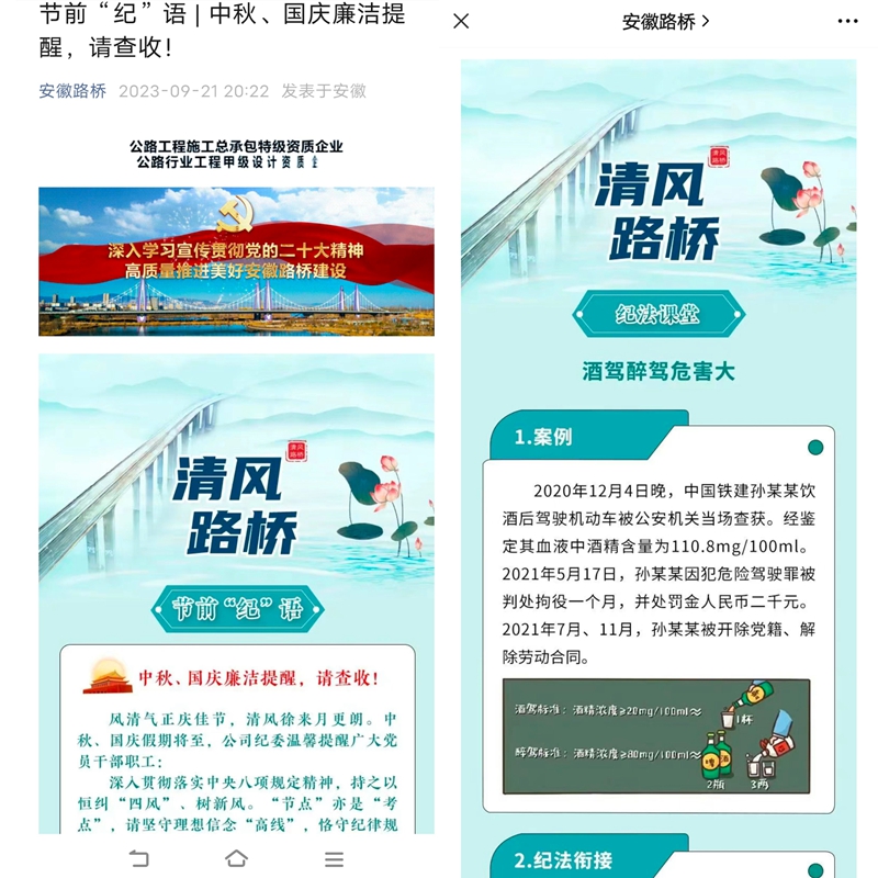 9月,公司陸續(xù)推出《紀(jì)法課堂|酒駕醉駕危害大》、《節(jié)前“紀(jì)”語(yǔ)|中秋、國(guó)慶廉潔提醒》,并組織學(xué)習(xí)中紀(jì)委、省紀(jì)委近期公開(kāi)曝光的違反中央八項(xiàng)規(guī)定精神問(wèn)題典型案例,向全體黨員干部發(fā)送廉潔過(guò)節(jié)提醒短信。中秋、國(guó)慶前,公司紀(jì)委通過(guò)微信公眾號(hào)、手機(jī)短信等形式密集推送廉潔提醒信息,重申節(jié)日紀(jì)律要求,做實(shí)作風(fēng)建設(shè)思想和紀(jì)律教育,早打招呼、早提醒。引導(dǎo)帶動(dòng)各級(jí)黨組織通過(guò)“三會(huì)一課”、主題黨日等,把全面從嚴(yán)治黨、加強(qiáng)節(jié)點(diǎn)作風(fēng)建設(shè)要求傳達(dá)到每一名黨員干部。市政分公司組織赴包公故里文化園開(kāi)展“筑防線葆廉潔本色 揚(yáng)正氣創(chuàng)清風(fēng)路橋”主題黨日活動(dòng);橋梁分公司、軌道分公司逐級(jí)對(duì)關(guān)鍵崗位人員開(kāi)展廉潔從業(yè)談心談話,持續(xù)提高黨員干部紀(jì)律規(guī)矩意識(shí)。時(shí)刻繃緊紀(jì)律規(guī)矩之弦,對(duì)標(biāo)作風(fēng)建設(shè)紀(jì)律規(guī)矩檢視律己,守紀(jì)律、知敬畏、過(guò)“廉”節(jié)。