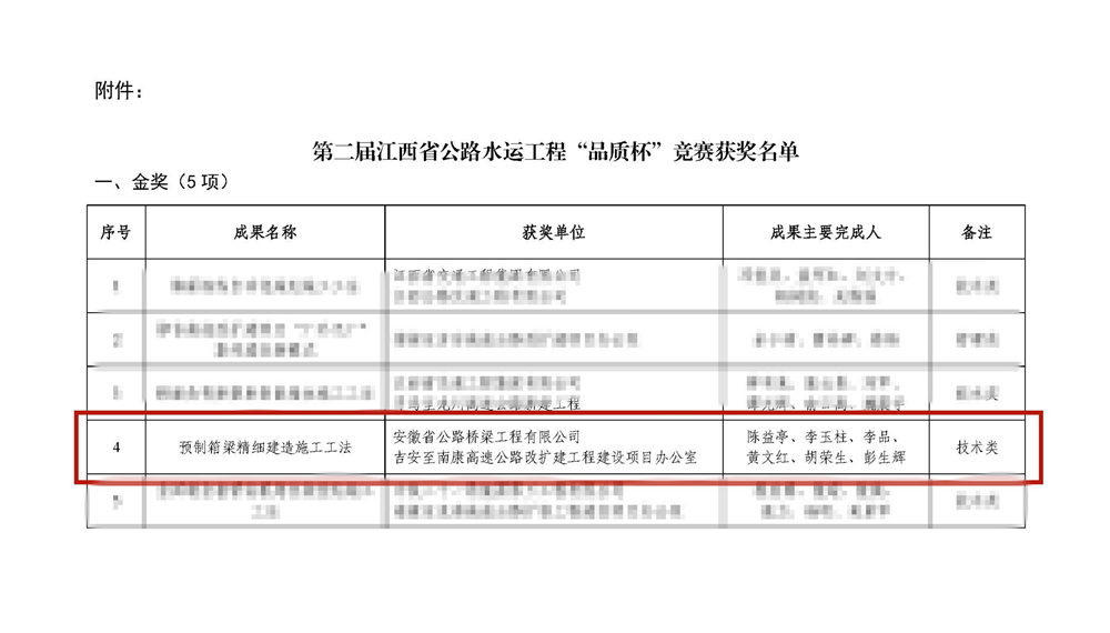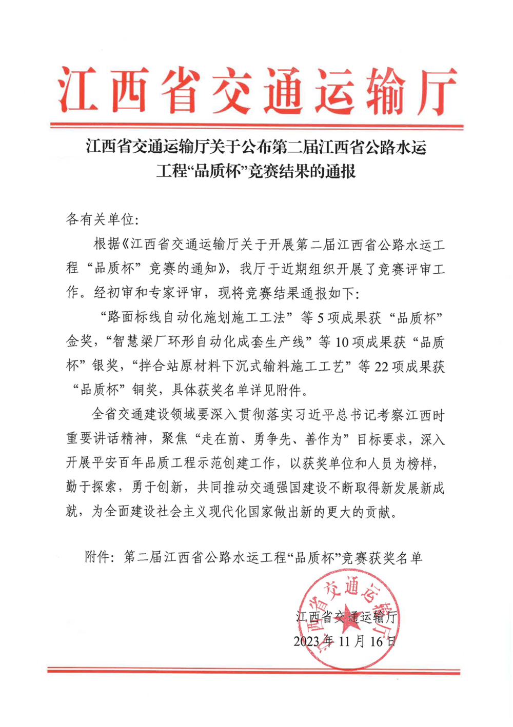 近日,江西省交通運輸廳發(fā)布了第二屆江西省公路水運工程“品質(zhì)杯”競賽結(jié)果,公司承建的吉康改擴建C1標(biāo)項目“預(yù)制箱梁精細建造施工工法”榮獲金獎。