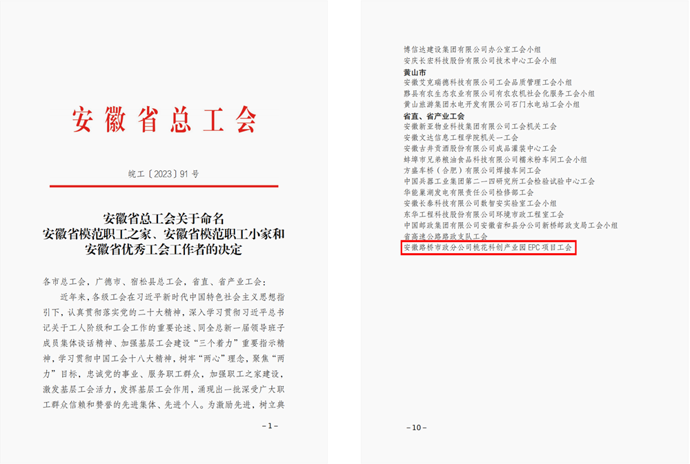 近日,安徽省總工會公布《安徽省總工會關(guān)于命名安徽省模范職工之家、安徽省模范職工小家和安徽省優(yōu)秀工會工作者的決定》,桃花科創(chuàng)產(chǎn)業(yè)園EPC項目工會榮獲“安徽省模范職工小家”榮譽稱號。