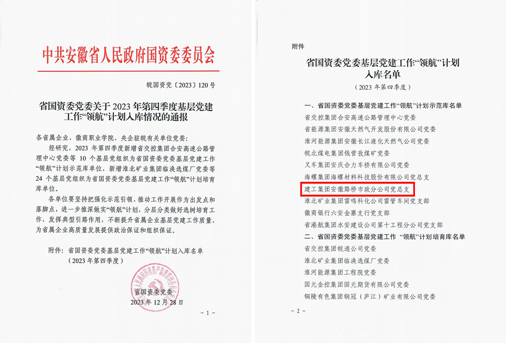 近日,安徽省國(guó)資委發(fā)布《關(guān)于2023年第四季度基層黨建工作“領(lǐng)航”計(jì)劃入庫(kù)情況的通報(bào)》,安徽路橋市政分公司黨總支成功入選省國(guó)資委黨委基層黨建工作“領(lǐng)航”計(jì)劃示范庫(kù)。