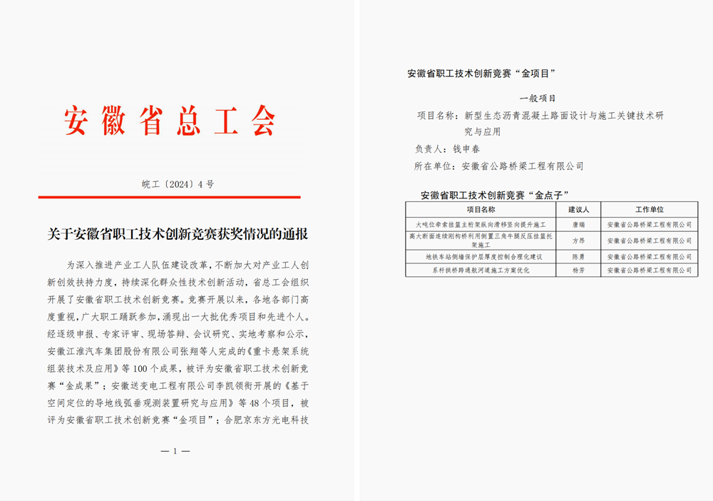 近日,安徽省總工會發(fā)布《關(guān)于安徽省職工技術(shù)創(chuàng)新競賽獲獎情況的通報》,公司報送的《新型生態(tài)瀝青混凝土路面設(shè)計與施工關(guān)鍵技術(shù)研究與應(yīng)用》獲評“金項目”,《大噸位牽索掛籃主桁架縱向滑移豎向提升施工》等4項建議獲評“金點子”。