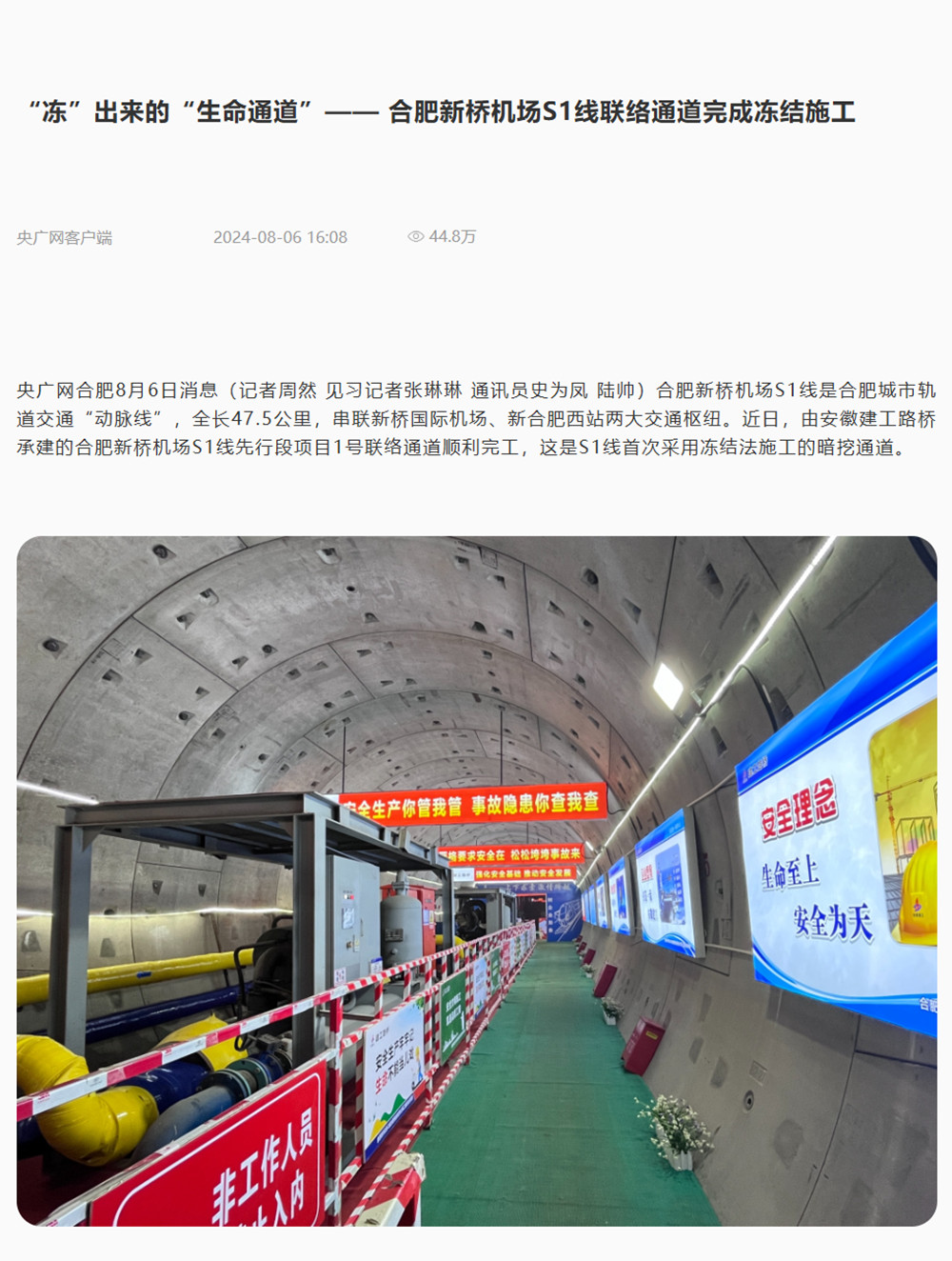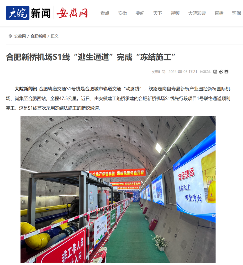 【名媒聚焦】央廣網(wǎng)、中安在線、大皖新聞:“凍”出來(lái)的“生命通道”——合肥新橋機(jī)場(chǎng)S1線凍結(jié)法施工聯(lián)絡(luò)通道順利完工