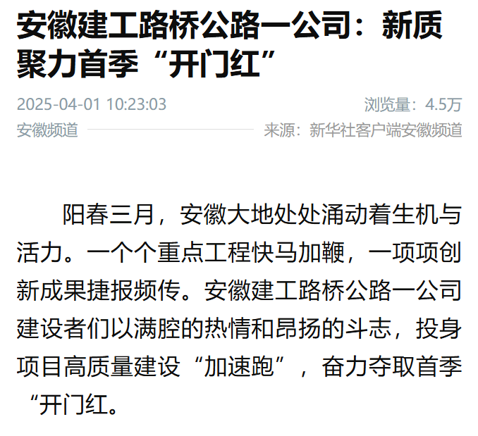 【央媒聚焦】新華社客戶端:安徽建工路橋公路一公司——新質(zhì)聚力首季“開(kāi)門紅”