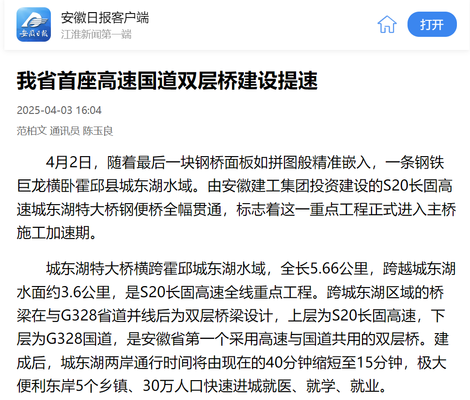 4月2日,隨著最后一塊鋼橋面板精準(zhǔn)嵌入,由安徽建工集團(tuán)投資建設(shè)的S20長固高速路基01標(biāo)段迎來重大節(jié)點——城東湖特大橋鋼便橋?qū)崿F(xiàn)全幅貫通,為主橋施工打通了"任督二脈"。
