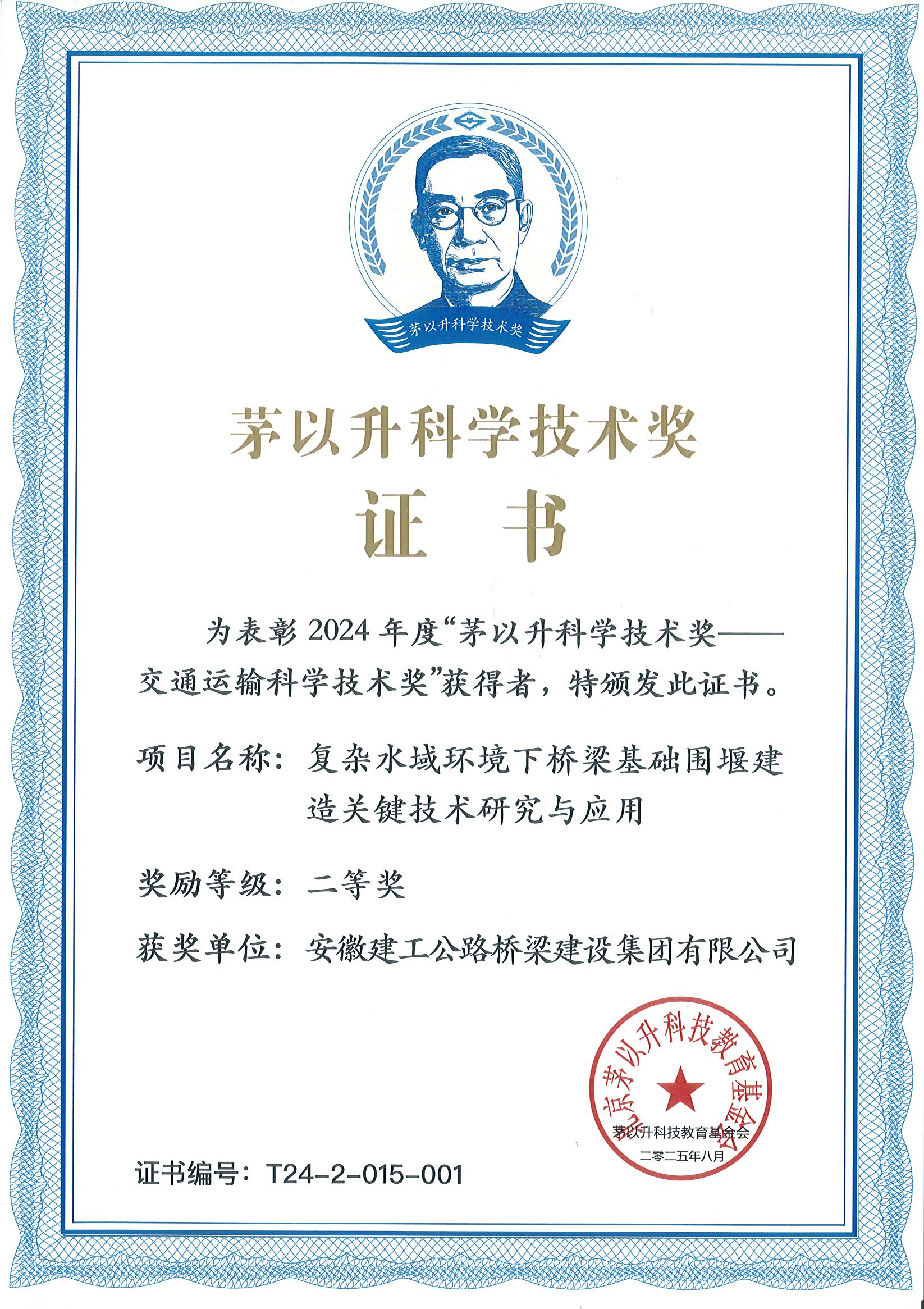 11月19日至21日,首屆道路交通學(xué)術(shù)年會(huì)暨“茅以升交通運(yùn)輸科學(xué)技術(shù)獎(jiǎng)”頒獎(jiǎng)大會(huì)在廣西南寧隆重舉行,公司自主申報(bào)的《復(fù)雜水域環(huán)境下橋梁基礎(chǔ)圍堰建造關(guān)鍵技術(shù)研究與應(yīng)用》課題榮獲“茅以升科學(xué)技術(shù)獎(jiǎng)-交通運(yùn)輸科學(xué)技術(shù)獎(jiǎng)”二等獎(jiǎng)。