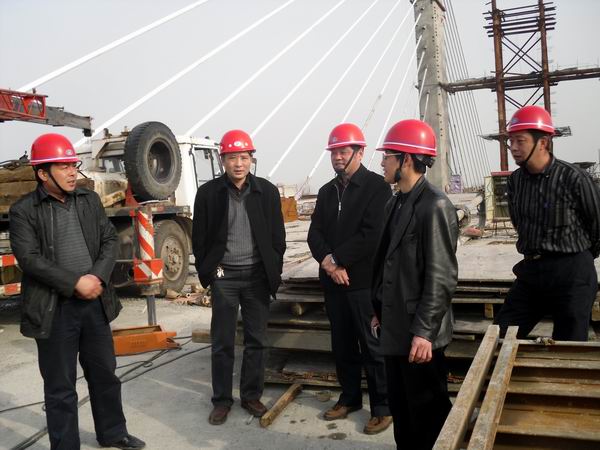 在大橋主跨施工現(xiàn)場,項目經(jīng)理江仲明向戴總一行詳細匯報了工程質(zhì)量、進度、安全控制情況。戴總對我部當前的工程進展情況表示滿意,希望我部再接再厲,特別是在工程收尾階段不能松懈,要一如既往的做好各項工作,繼續(xù)加強文明施工,扎實推進項目精細化管理。