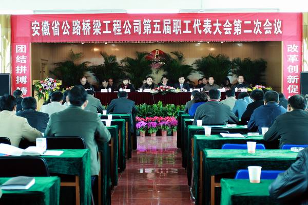 上午8:30,在莊嚴的國歌聲中,第五屆職工代表大會第二次會議正式開幕。會議由公司黨委委員、副總經(jīng)理、總工程師彭申凱主持。公司總經(jīng)理汪衛(wèi)東在會上作了題為《夯實管理基礎(chǔ),拓展發(fā)展空間,為推動安徽路橋快速發(fā)展而努力奮進》的工作報告。報告回顧總結(jié)了2009年工作。2009年是新世紀以來我國經(jīng)濟發(fā)展最為困難的一年。公司面對復(fù)雜快變的市場環(huán)境,在集團公司的科學(xué)指導(dǎo)下,主動適應(yīng)市場,搶抓機遇,呈現(xiàn)了平穩(wěn)較快發(fā)展的良好局面,譜寫了實現(xiàn)新崛起的動人篇章。公司先后榮獲安徽省建筑業(yè)企業(yè)五十強、合肥市委市政府文明單位等市廳級以上集體榮譽11項,形象大幅提升。全年新簽合同額14.7億元,同比增長20%,經(jīng)營業(yè)績再創(chuàng)新高。完成總產(chǎn)值約11.08億元,同比增長10.8%,施工產(chǎn)值再上新臺階。主營業(yè)務(wù)收入8.34億元,實現(xiàn)利潤總額530.3萬元,同比增長35.22%,資產(chǎn)保值增長率106.5%,經(jīng)濟效益穩(wěn)步增長。創(chuàng)“黃山杯”、“建工杯”各1項,各類科技進步獎(工法)8項,創(chuàng)建安全文明示范工地5個,連續(xù)三年無重大安全和質(zhì)量事故。