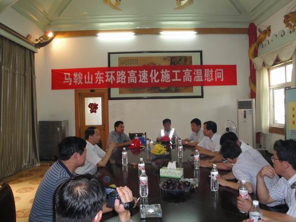 在我項目部大廳,王書記首先發(fā)表了熱情洋溢的講話,高度贊揚了我項目勇戰(zhàn)高溫、搶抓工期、誓保質量的大無畏施工精神。隨后,王書記又送上了慰問信,并與員工代表們一一握手,發(fā)放慰問金、慰問品。最后,在項目部會議室,王書記一行與蘇指揮長,蔡主任、江主任,總監(jiān)代表郭亮以及我部項目經理冷峰等進行座談,詳細了解了我南環(huán)02標項目的整體情況以及近期施工的進展情況,希望我部繼續(xù)發(fā)揚安徽省路橋公司攻堅克難的優(yōu)良傳統(tǒng),保質保量的如期完成東環(huán)02標項目建設任務。