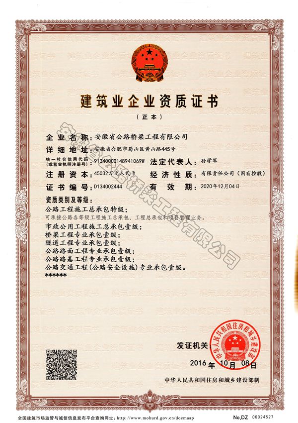 近日,住房和城鄉(xiāng)建設(shè)部發(fā)布公告,公司特級資質(zhì)順利獲批,成為安徽省內(nèi)首家也是唯一一家同時擁有公路工程施工總承包特級資質(zhì)和公路行業(yè)工程設(shè)計甲級資質(zhì)的企業(yè)。
