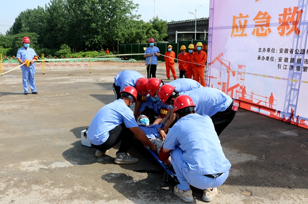 5月29日,公司在引江濟(jì)淮繁華大道項(xiàng)目舉行高處墜落事故應(yīng)急演練。公司領(lǐng)導(dǎo)班子及機(jī)關(guān)各部門負(fù)責(zé)人、分子公司領(lǐng)導(dǎo)班子成員、各項(xiàng)目經(jīng)理、繁華大道項(xiàng)目全體員工及工友代表參觀演練。